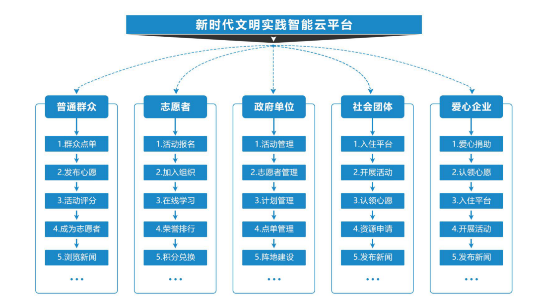 基于新時代文明實踐中心的建設需求,融合宣傳、學習、活動、志愿者服務于一體,為“群眾點單、中心(所、站)制單、層層派單”提供全流程技術支撐服務,致力于打造集宣傳展示、互動互通、管理調度于一體的新型信息化互聯網 + 新時代文明實踐中心。